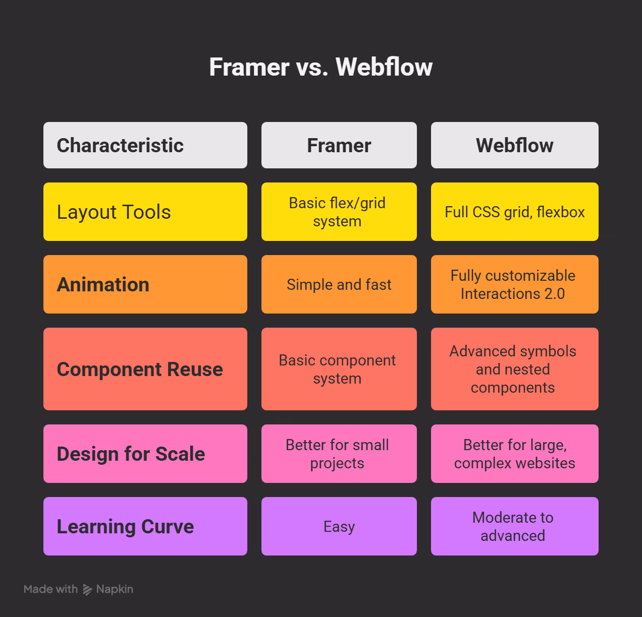 Ultimately, Framer is easier to learn for designers but offers less depth for developers. Webflow is harder to master but pays off with unparalleled flexibility and control.