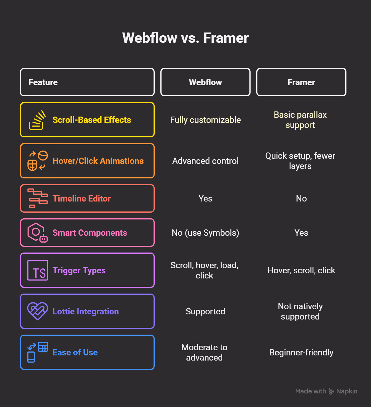 In short, Webflow gives you the raw power to build production-grade animation systems, ideal for brands and agencies crafting high-impact experiences. Framer offers a fast and flexible animation toolkit that makes it perfect for rapid prototyping and visually-driven design.