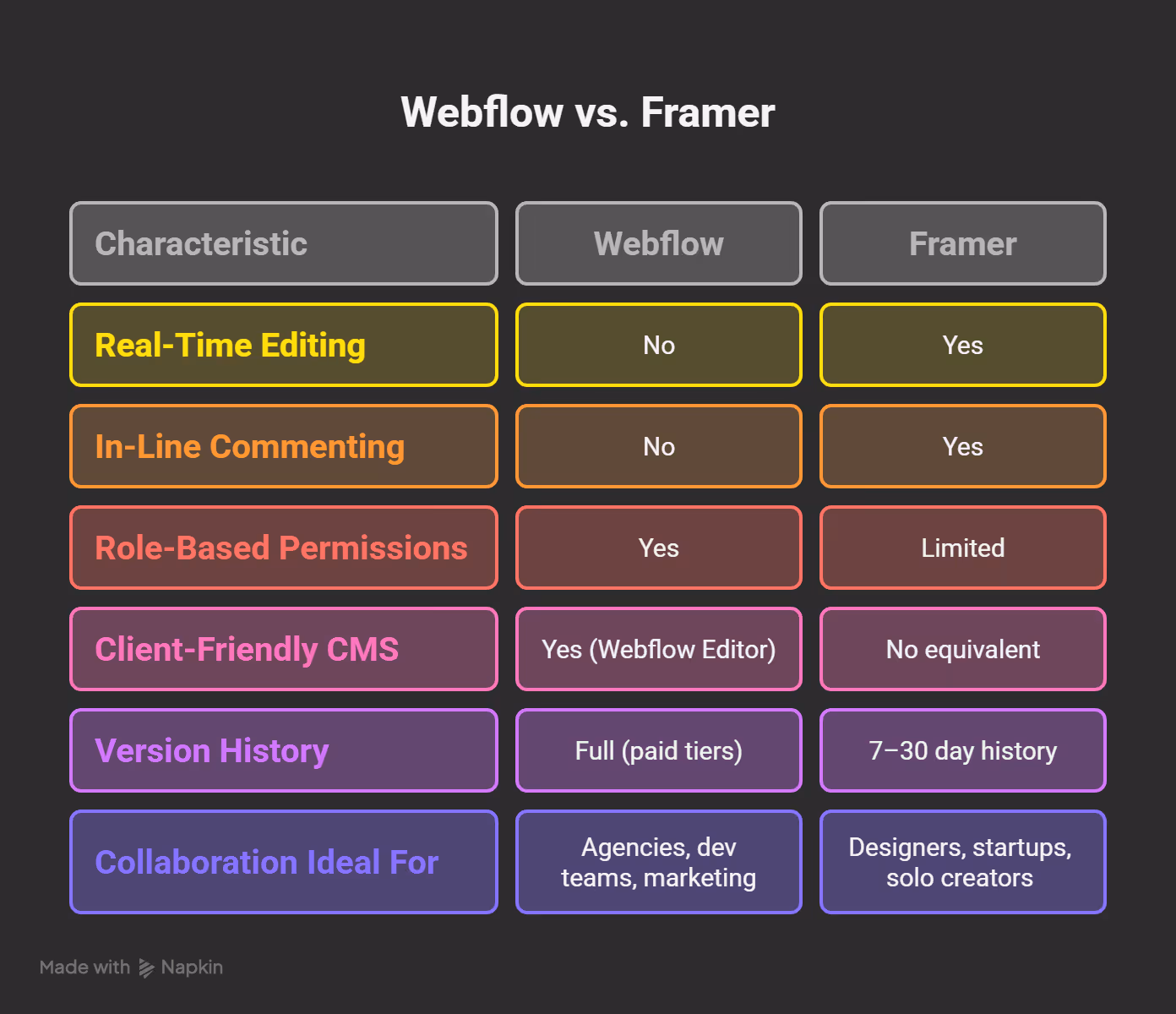 In short, Framer is optimized for real-time design collaboration. Webflow is built for structured content workflows, larger teams, and agency-client dynamics. Each platform supports teamwork—but in different, purpose-driven ways.