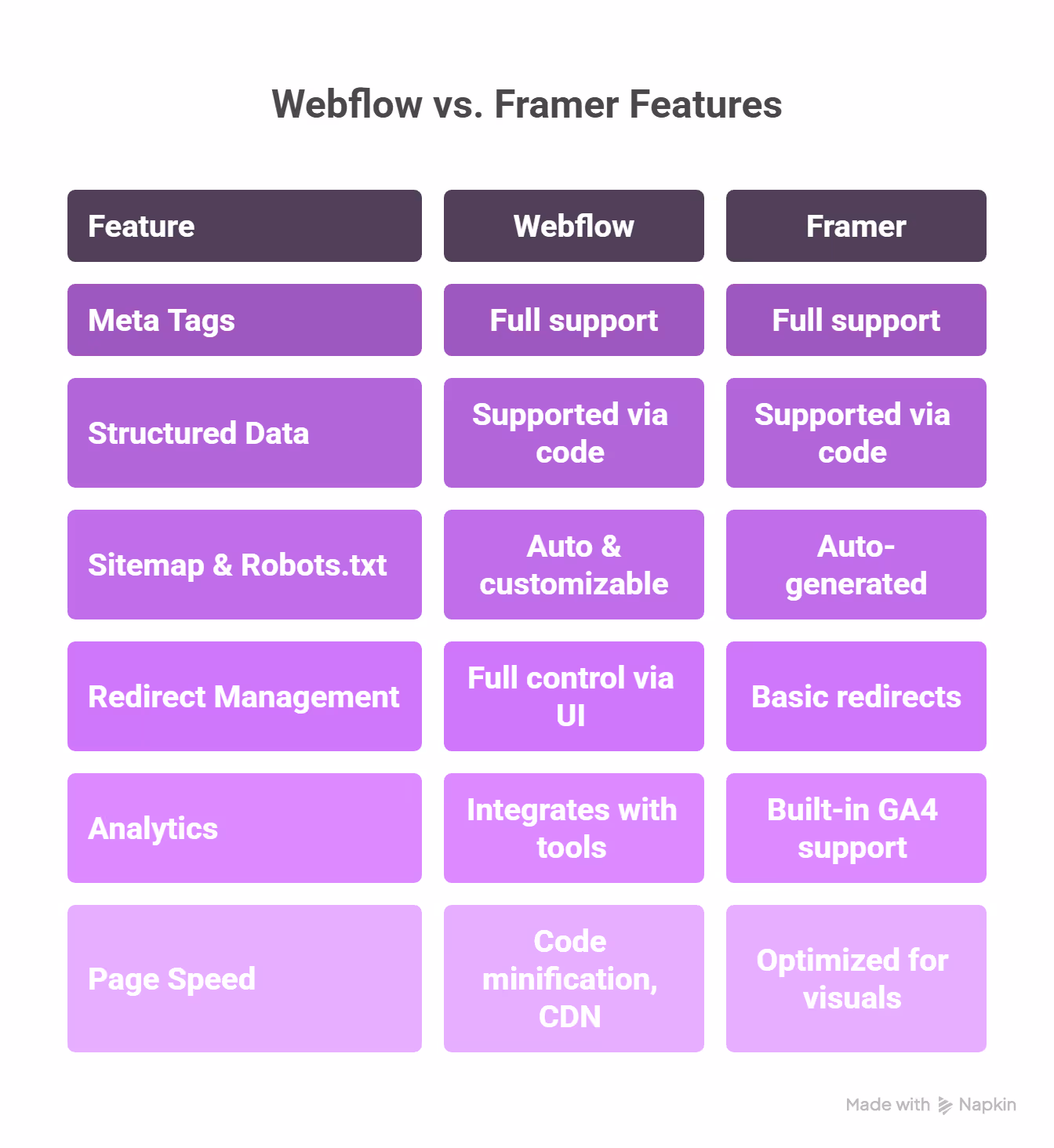 Webflow wins in this category. It offers full control over SEO tags, structured data, clean code output, canonical tags, and integrations with tools like Google Tag Manager. Framer covers the SEO basics but lacks advanced tools for content-heavy or SEO-driven sites.