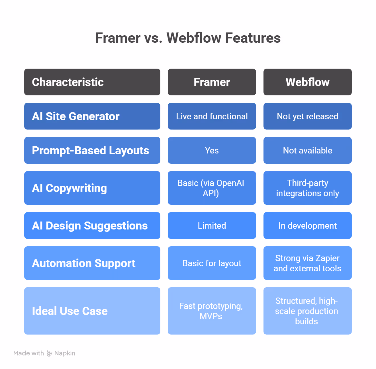 Not yet. Framer currently leads with its AI website builder, allowing users to generate full layouts from text prompts. Webflow has announced AI features but hasn’t rolled out a native site generator as of mid-2025.
